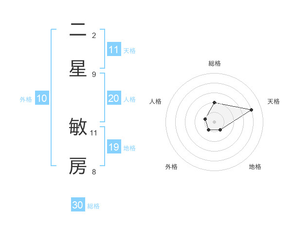 二星 敏房さんの総格は30画の2点!