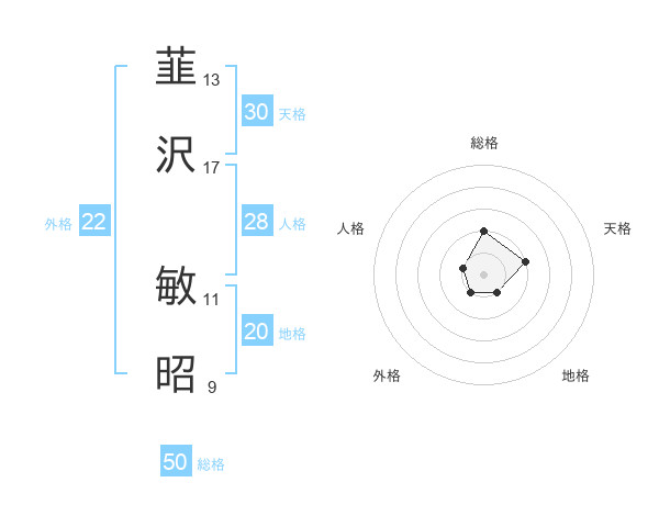 韮沢 敏昭さんの総格は50画の2点!