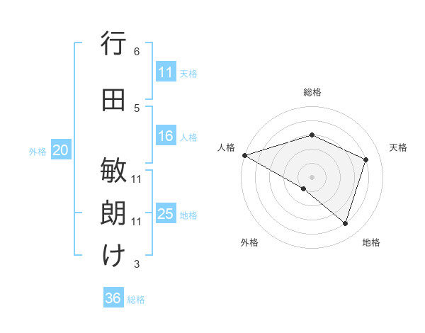 行田 敏朗けさんを姓名の画数から五運を鑑定