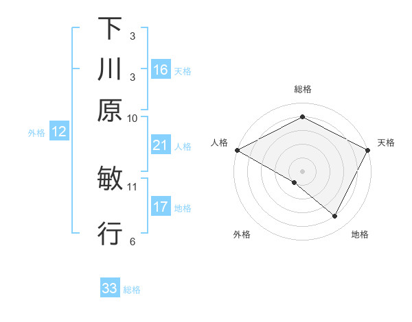 下川原 敏行さんの総格は33画の4点!