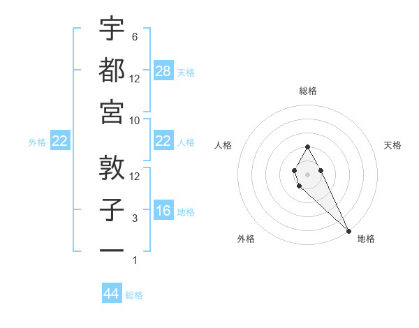 宇都宮 敦子一さんを姓名の画数から五運を鑑定