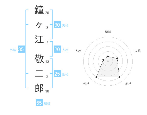 鐘ヶ江 敬二郎さんの総格は55画の1点!