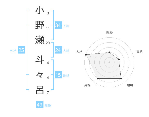 小野瀬 斗々呂さんを姓名の画数から五運を鑑定
