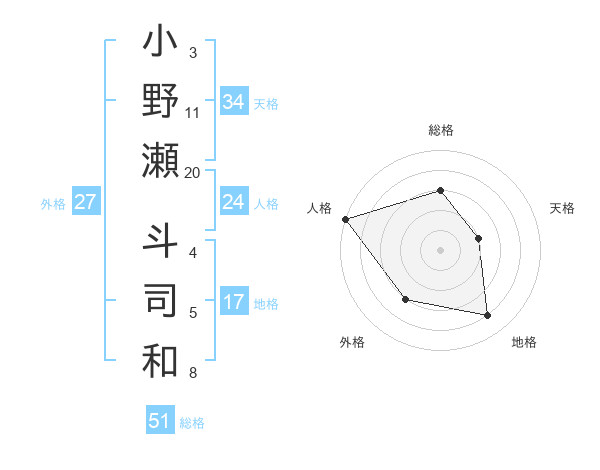 小野瀬 斗司和さんを姓名の画数から五運を鑑定
