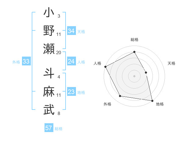 小野瀬 斗麻武さんの総格は57画の4点!