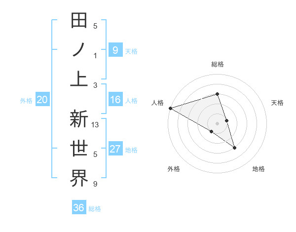 田ノ上 新世界さんを姓名の画数から五運を鑑定