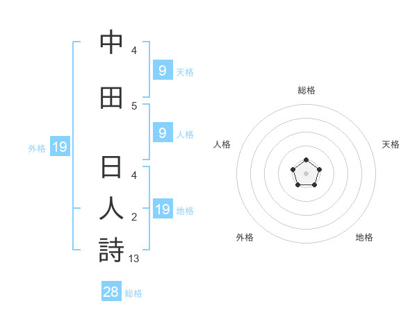 中田 日人詩さんを姓名の画数から五運を鑑定