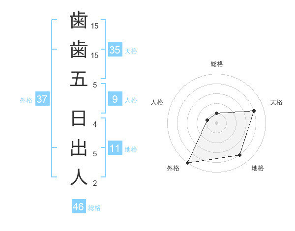 歯歯五 日出人さんの外格は37画の5点!