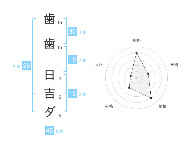 歯歯 日吉ダさんの総格は45画の4点!