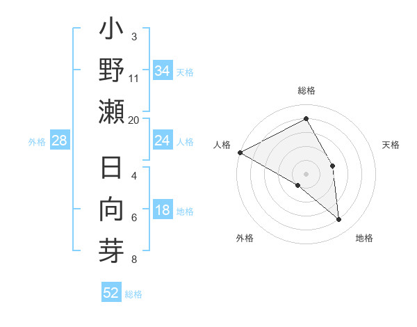 小野瀬 日向芽さんの総格は52画の4点!