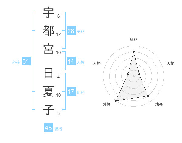 宇都宮 日夏子さんを姓名の画数から五運を鑑定
