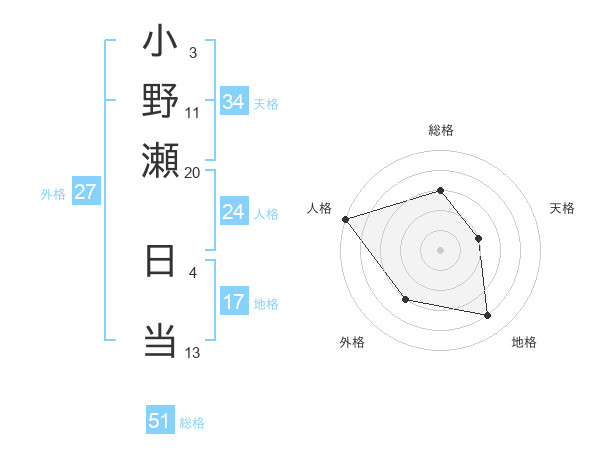 小野瀬 日当さんを姓名の画数から五運を鑑定
