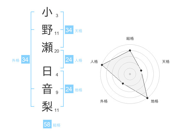 小野瀬 日音梨さんを姓名の画数から五運を鑑定