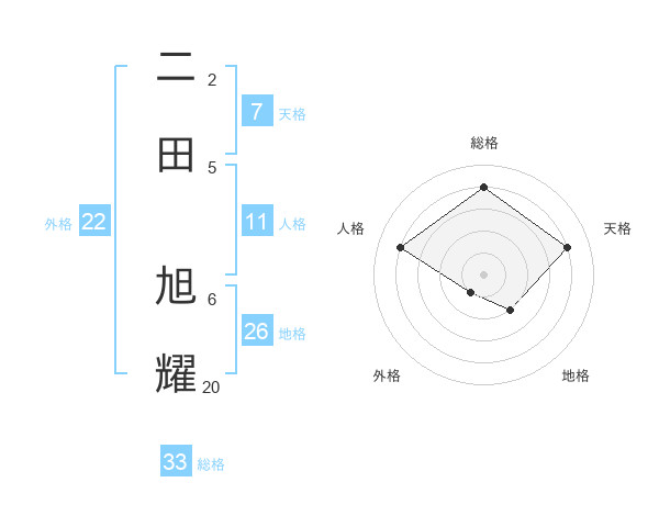 二田 旭耀さんの総格は33画の4点!