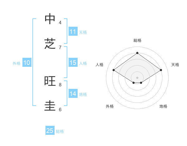 中芝 旺圭さんの総格は25画の4点!