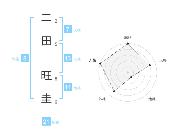二田 旺圭さんの総格は21画の5点!