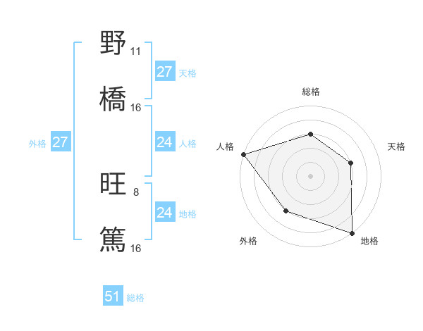 野橋 旺篤さんを姓名の画数から五運を鑑定