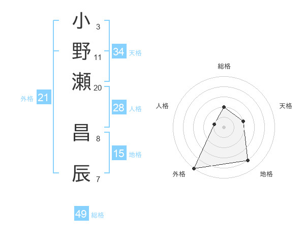 小野瀬 昌辰さんの総格は49画の2点!
