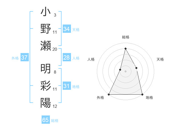 小野瀬 明彩陽さんの総格は65画の4点!
