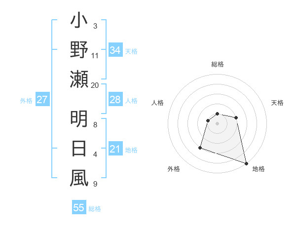 小野瀬 明日風さんの総格は55画の1点