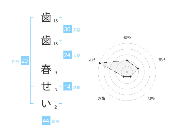 歯歯 春せいさんの総格は44画の2点!