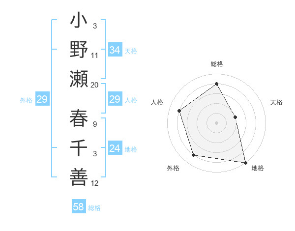 小野瀬 春千善さんを姓名の画数から五運を鑑定
