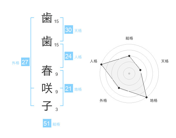 歯歯 春咲子さんの総格は51画の3点!