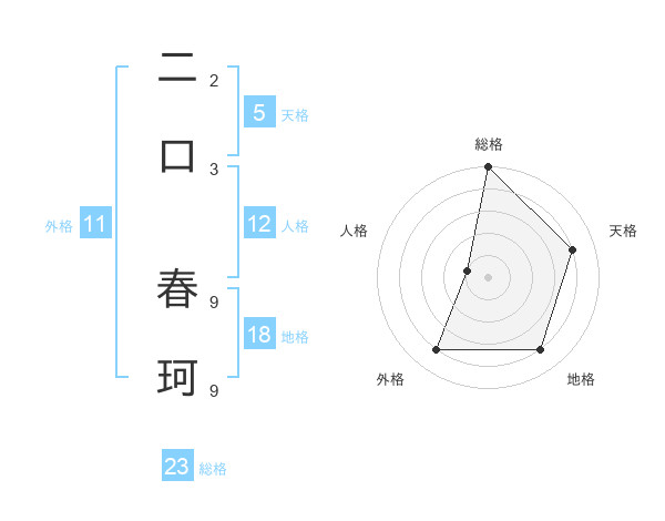 二口 春珂さんの総格は23画の5点!