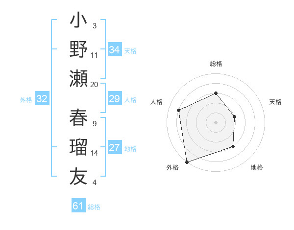 小野瀬 春瑠友さんを姓名の画数から五運を鑑定