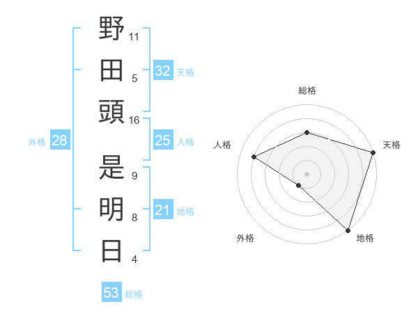野田頭 是明日さんを姓名の画数から五運を鑑定