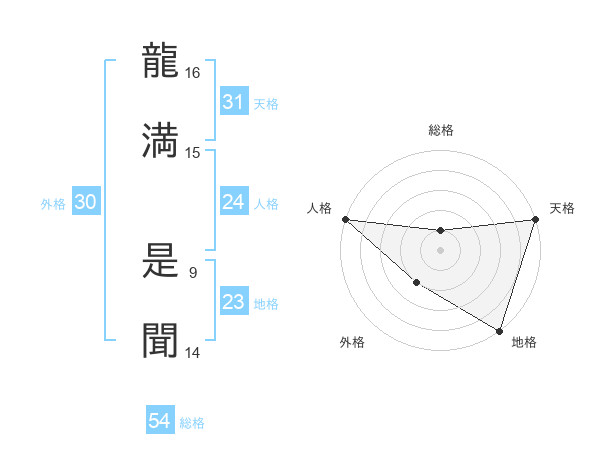 龍満 是聞さんの総格は54画の1点!