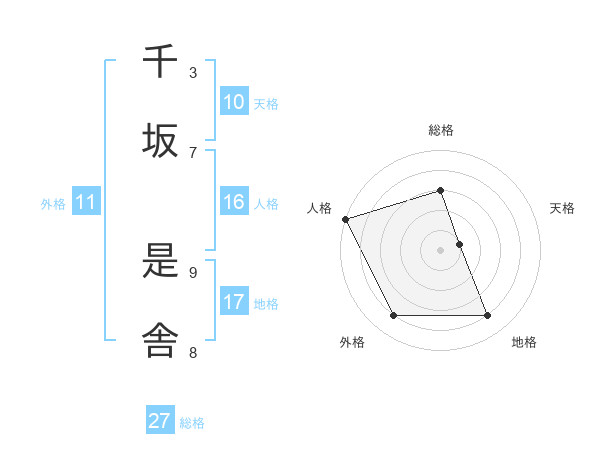 千坂 是舎さんを姓名の画数から五運を鑑定