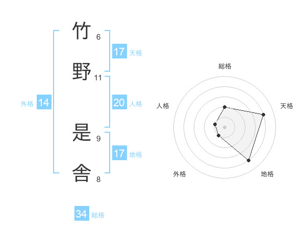 竹野 是舎さんの総格は34画の2点!