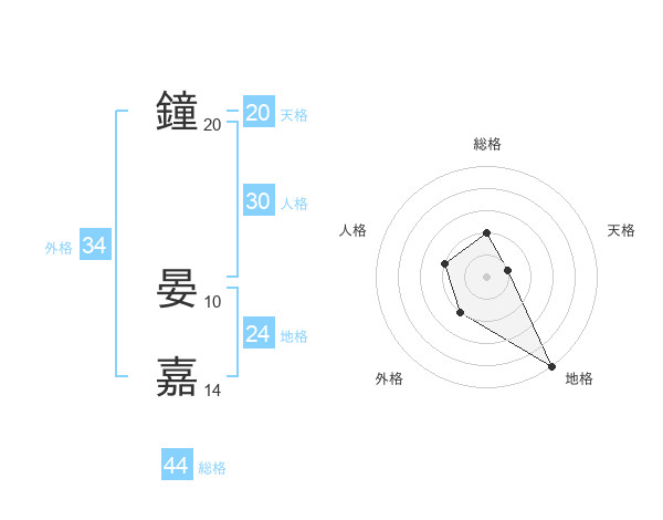 鐘 晏嘉さんの総格は44画の2点!