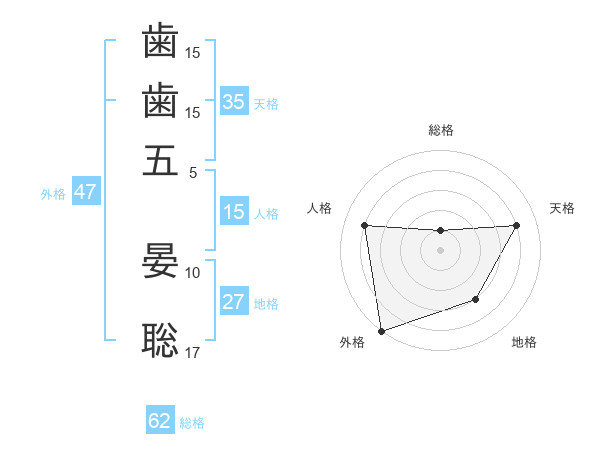 歯歯五 晏聡さんの外格は47画の5点!