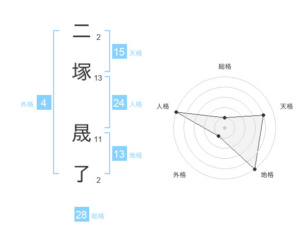 二塚 晟了さんの総格は28画の1点!