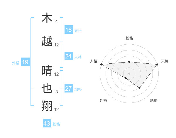 木越 晴也翔さんの天格は16画の5点!