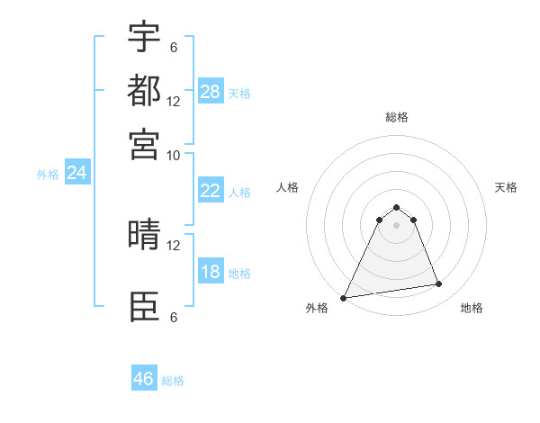 宇都宮 晴臣さんの総格は46画の1点!