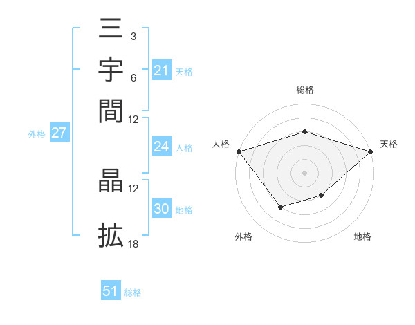 三宇間 晶拡さんの総格は51画の3点!