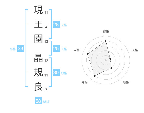 現王園 晶規良さんを姓名の画数から五運を鑑定
