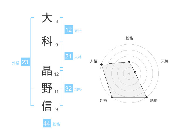 大科 晶野信さんを姓名の画数から五運を鑑定