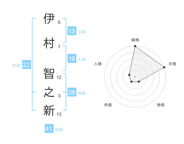 伊村 智之新さんを姓名の画数から五運を鑑定