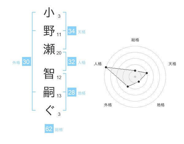 小野瀬 智嗣ぐさんの天格は34画の2点!