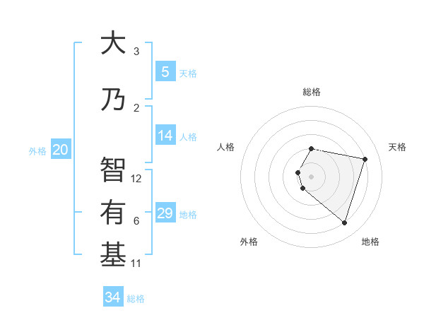 大乃 智有基さんを姓名の画数から五運を鑑定