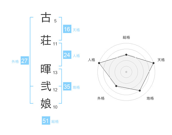 古荘 暉弐娘さんを姓名の画数から五運を鑑定
