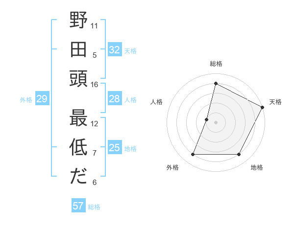 野田頭 最低ださんを姓名の画数から五運を鑑定