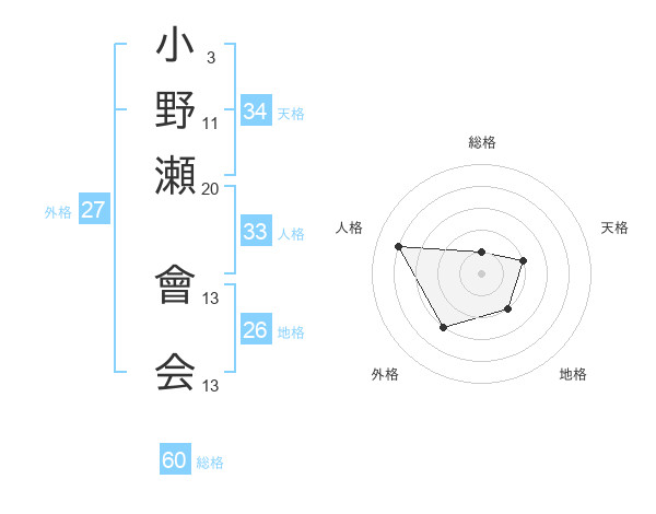 小野瀬 會会さんを姓名の画数から五運を鑑定
