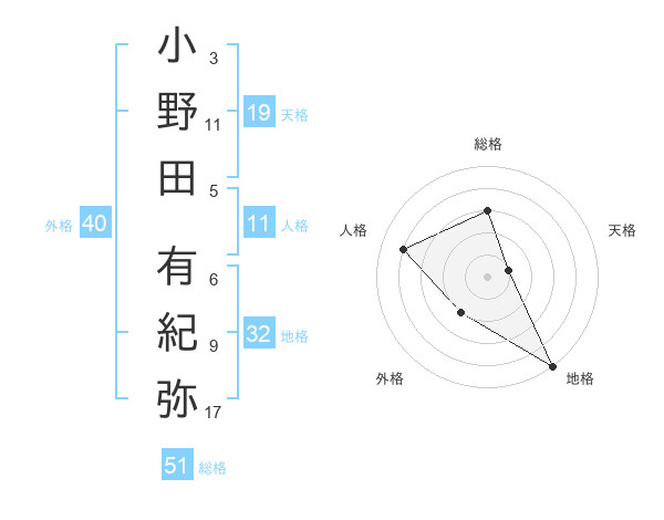 小野田 有紀弥さんの総格は51画の3点