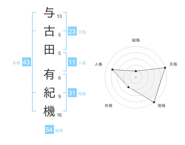 与古田 有紀機さんを姓名の画数から五運を鑑定