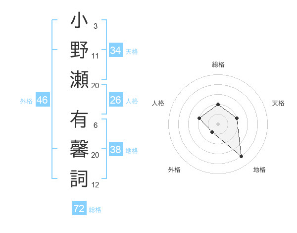 小野瀬 有馨詞さんを姓名の画数から五運を鑑定